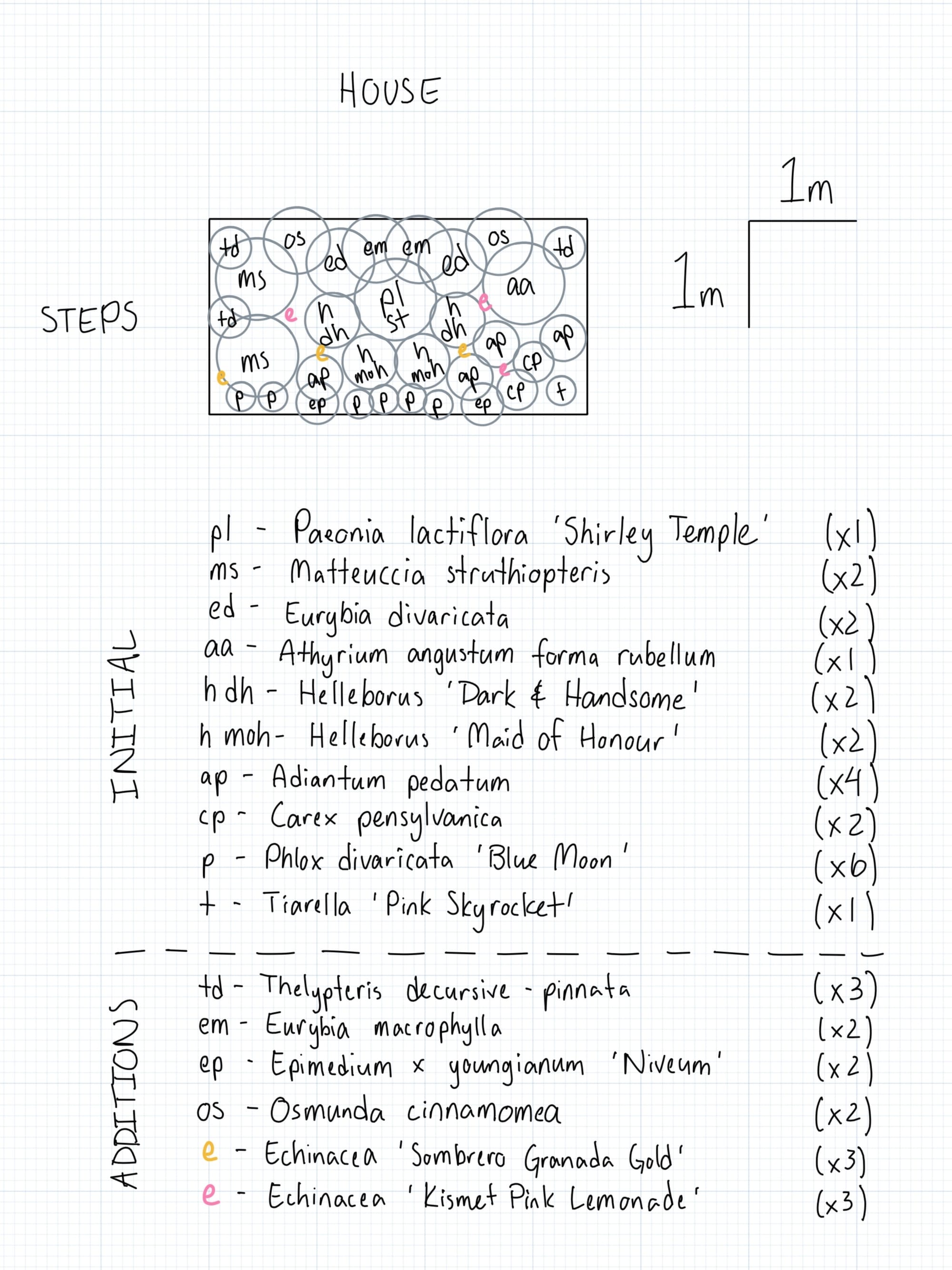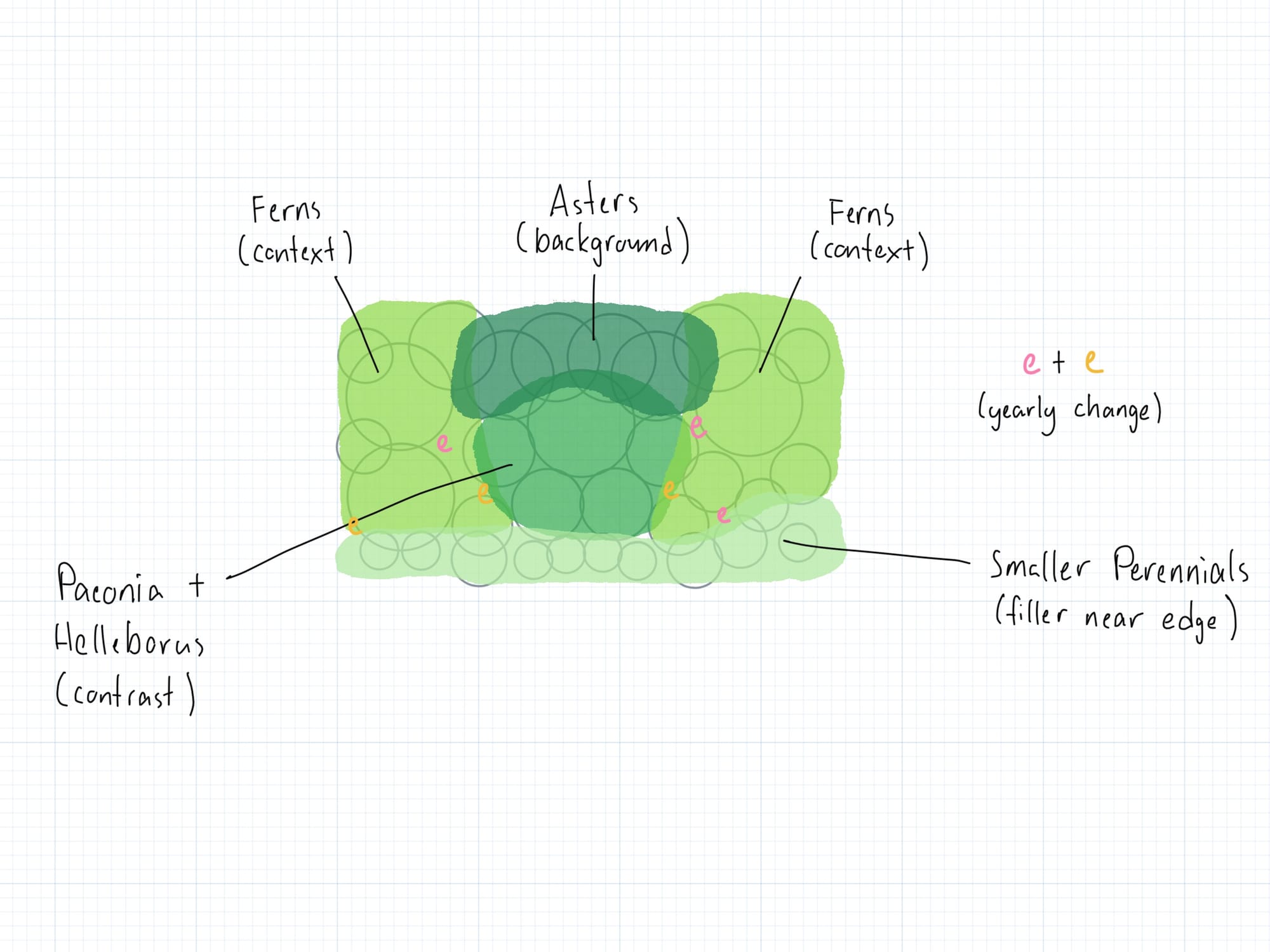 The cherry on top of this layout is the use of two perennials (the coloured e’s) that will be allowed to seed themselves freely throughout the bed. This will add a controlled pinch of chaos to the space, as it will be slightly different year to year. This is a trick I use (when appropriate) to add a dynamic feeling to a garden. It’s the same, but slightly different.