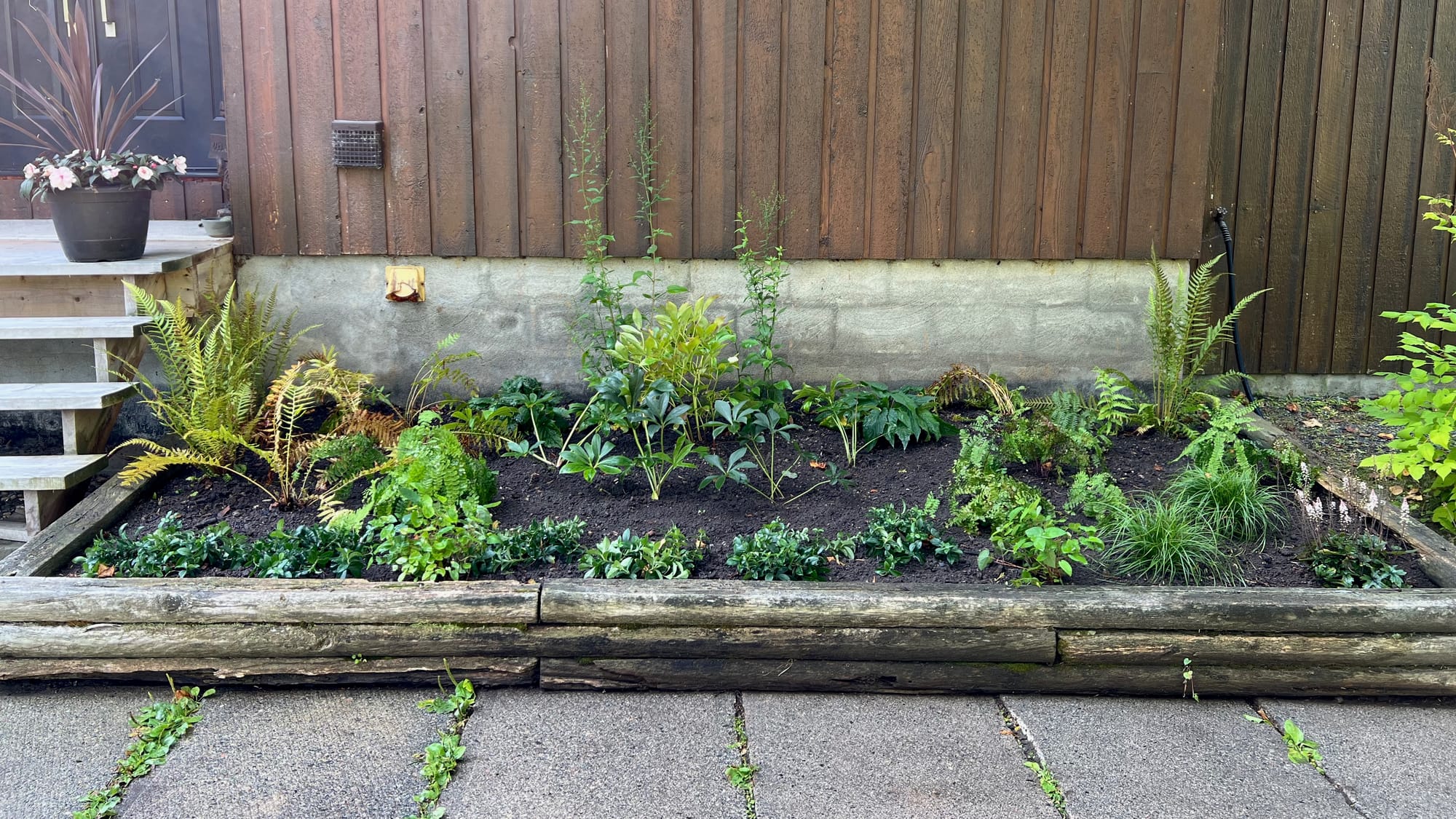 For this small garden, you can strip everything back to the image above. There are two framing clumps of ferns, a backdrop of perennials that get tall but don’t flower until fall, a centre clump that provides contrast through structure and leaf texture, and finally smaller filler plants along the front edge of the bed that borders the main pathway to the front door.